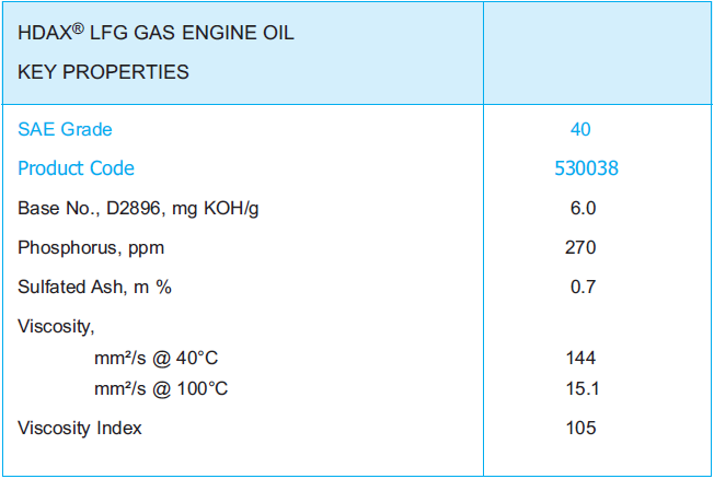 is a premium quality, medium ash, dispersant/detergent type gas engine oil formulated especially for four stroke landfill gas applications. HDAX® LFG Gas Engine Oil is formulated with superior ISOSYN® technology, a combination of high performance hydrocracked base fluids and a robust inhibitor package provides exceptional protection and maximized oil drain intervals even in the presence of the most aggressive landfill gases.