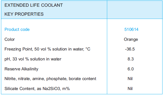 based on extended-life organic acid Carboxylate Technology in ethylene glycol which, when mixed at 50% by volume with water, provides long-term protection of the cooling systems of gasoline and light and heavyduty diesel engines.