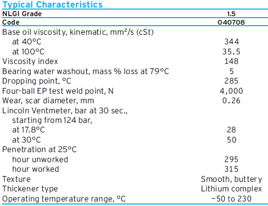 applications operating under the most extreme high and low temperature conditions and for those diffi cult applications requiring extended lubrication intervals. It is manufactured using selected high-viscosity synthetic base oils, a lithium complex thickener, rust and oxidation inhibitors, and extreme pressure and tackiness additives. It is light tan in appearance and smooth and buttery in texture. It is approved for the new NLGI Certifi cation Mark LB.