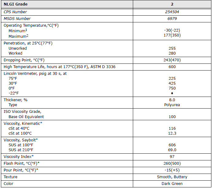roller bearing grease. It is formulated with ISOSYN® base stocks, a synthetic polyurea ashless organic thickener, and high performance rust and oxidation inhibitors (the latter to provide superior rust protection in severe applications). Its texture is smooth and buttery and its color is dark green.